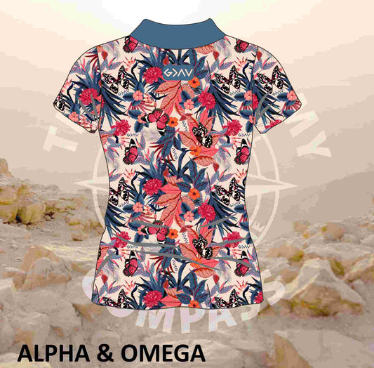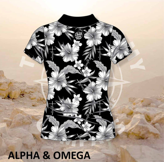 Alpha and Omega Child of God Grey Hibiscus Ladies Golf Shirt