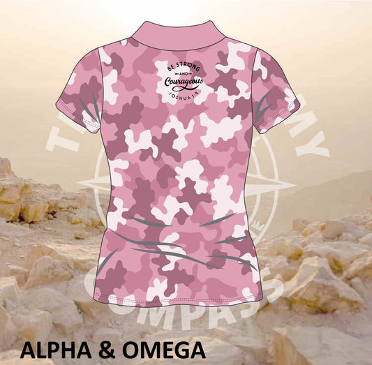 Alpha and Omega Be Strong Pink Camo Ladies Golf Shirt