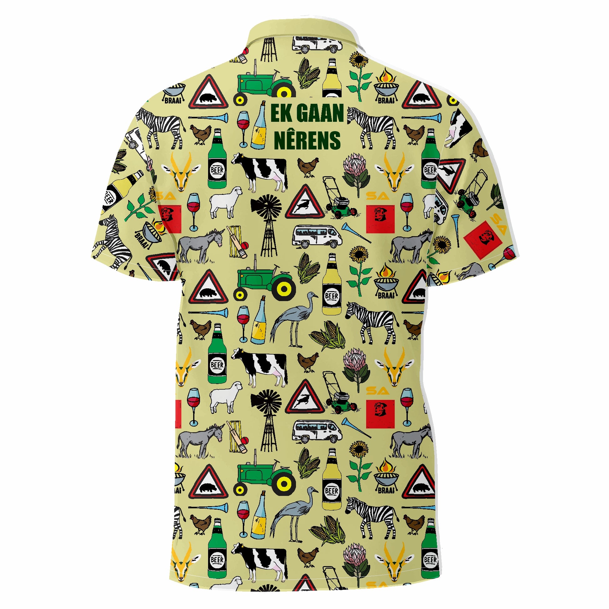 Add a touch of class to your wardrobe with our 44 Klub Ek Gaan Nêrens - Suid Afrika - Beige Printed Golf Shirt
