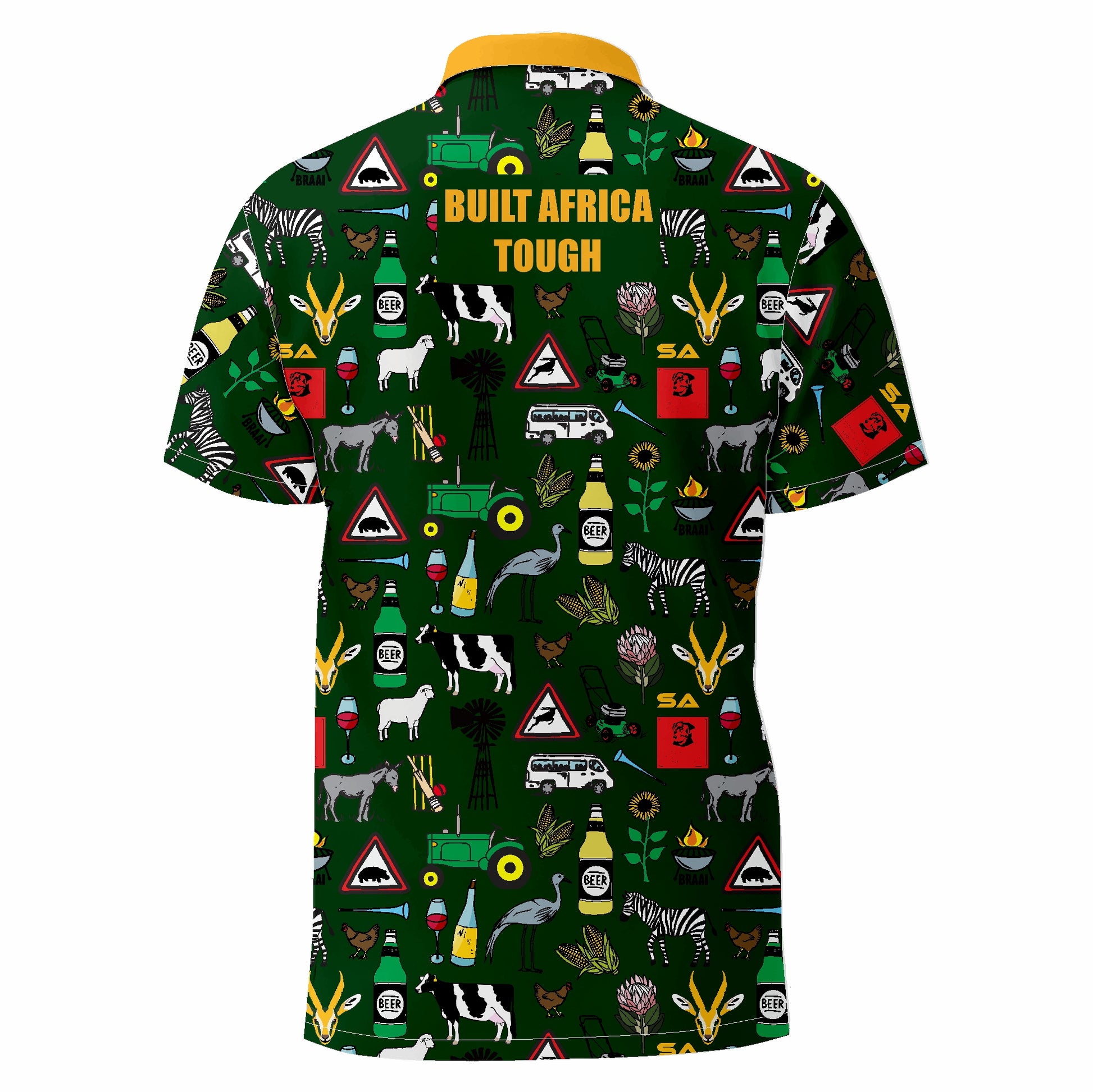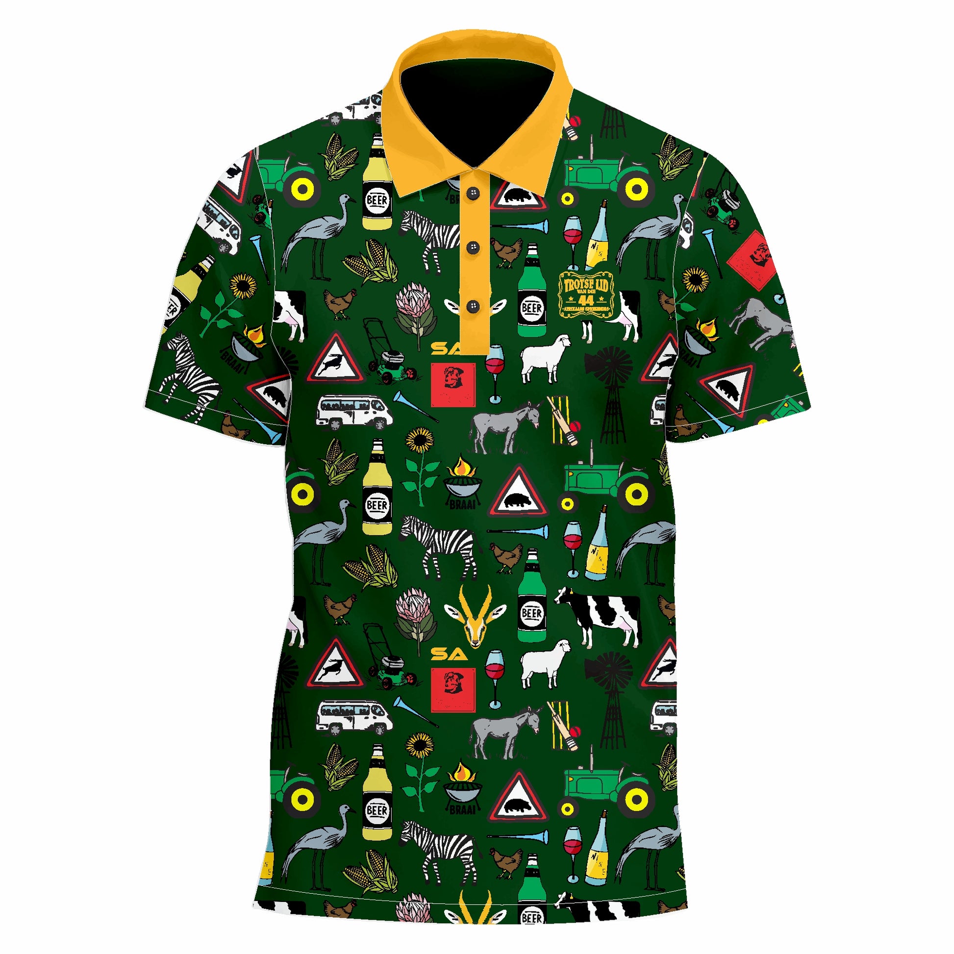 Add a touch of class to your wardrobe with our 44 Klub- Built Africa Tough- Suid Afrika - Groen en Goud Golf Shirt