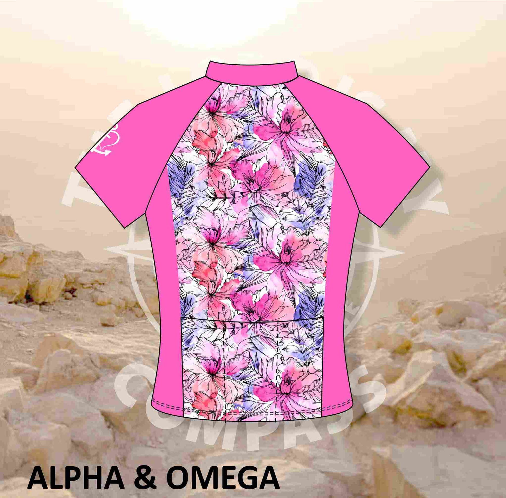 Alpha and Omega WATER COLOR FLORAL Pro Cycling Shirt. This is a custom unique print, made from the finest Italian and locally sourced fabrics. Please note this is a tightly fitted cycle top.