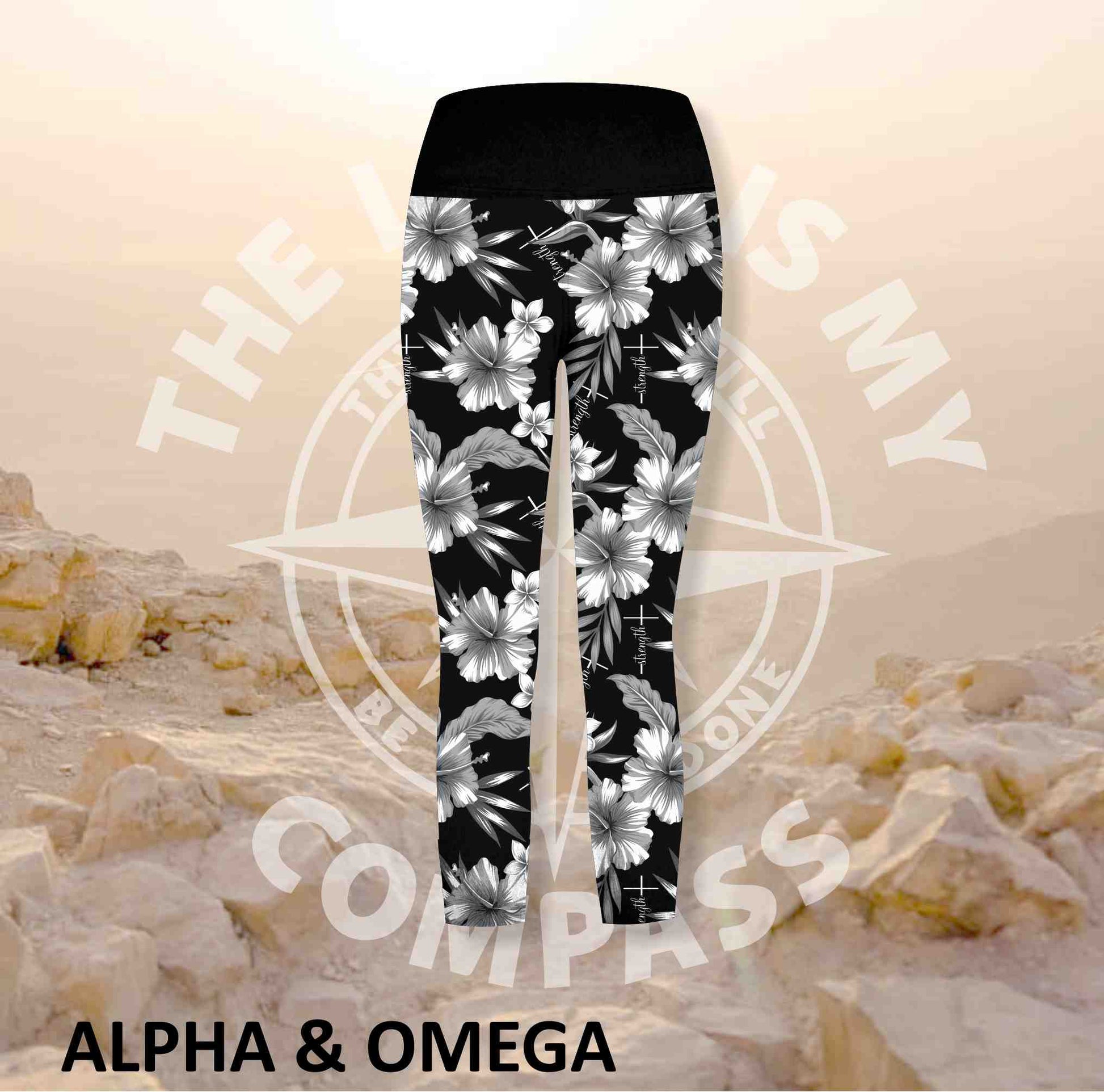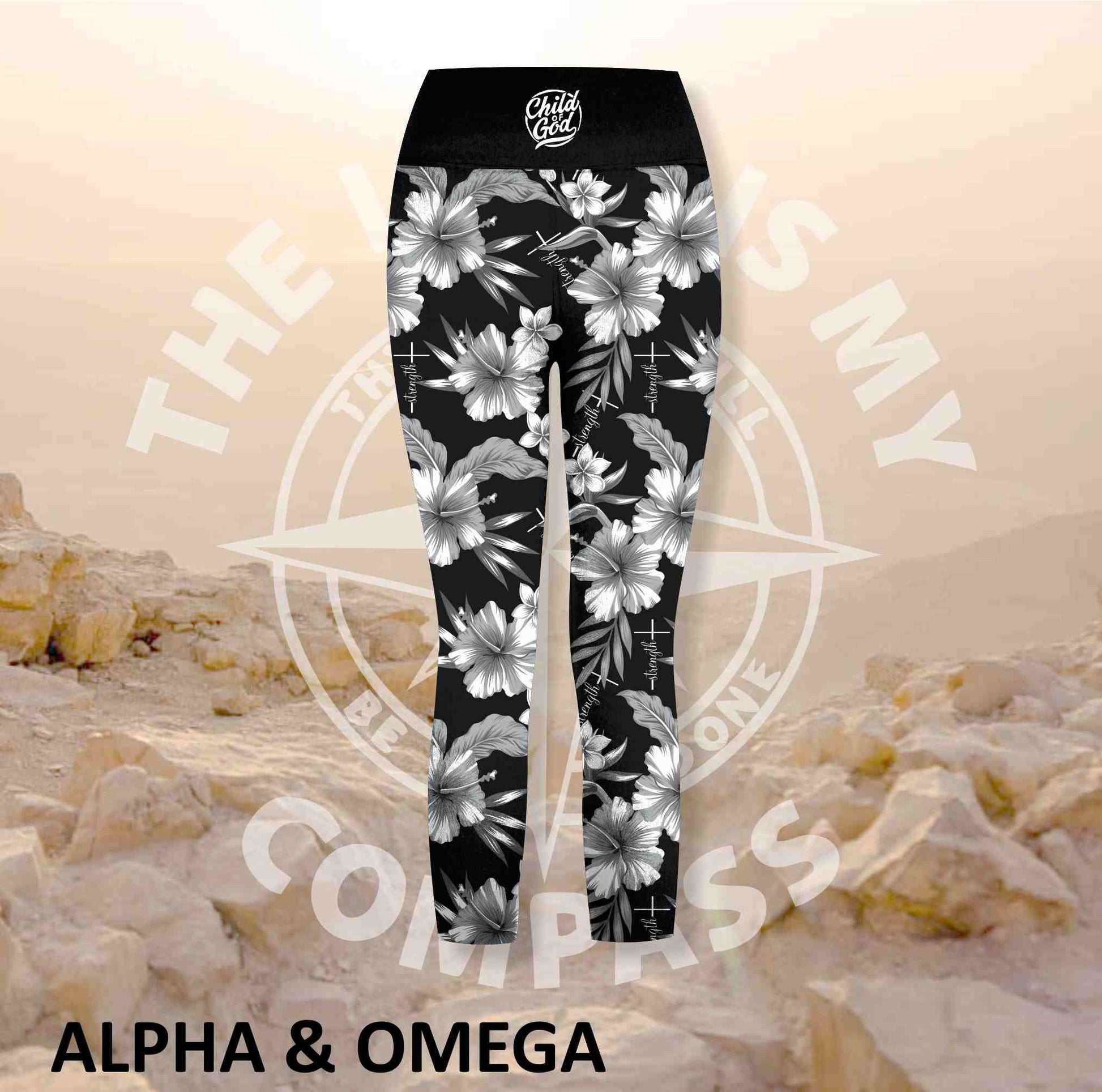 Alpha And Omega Child of God Grey Hibiscus three-quarter tights have a high waist with 10mm elastic inner, which can be folded over and includes a pocket on the leg . Made from 320g sublimation print poly spandex. All seams are flat locked.