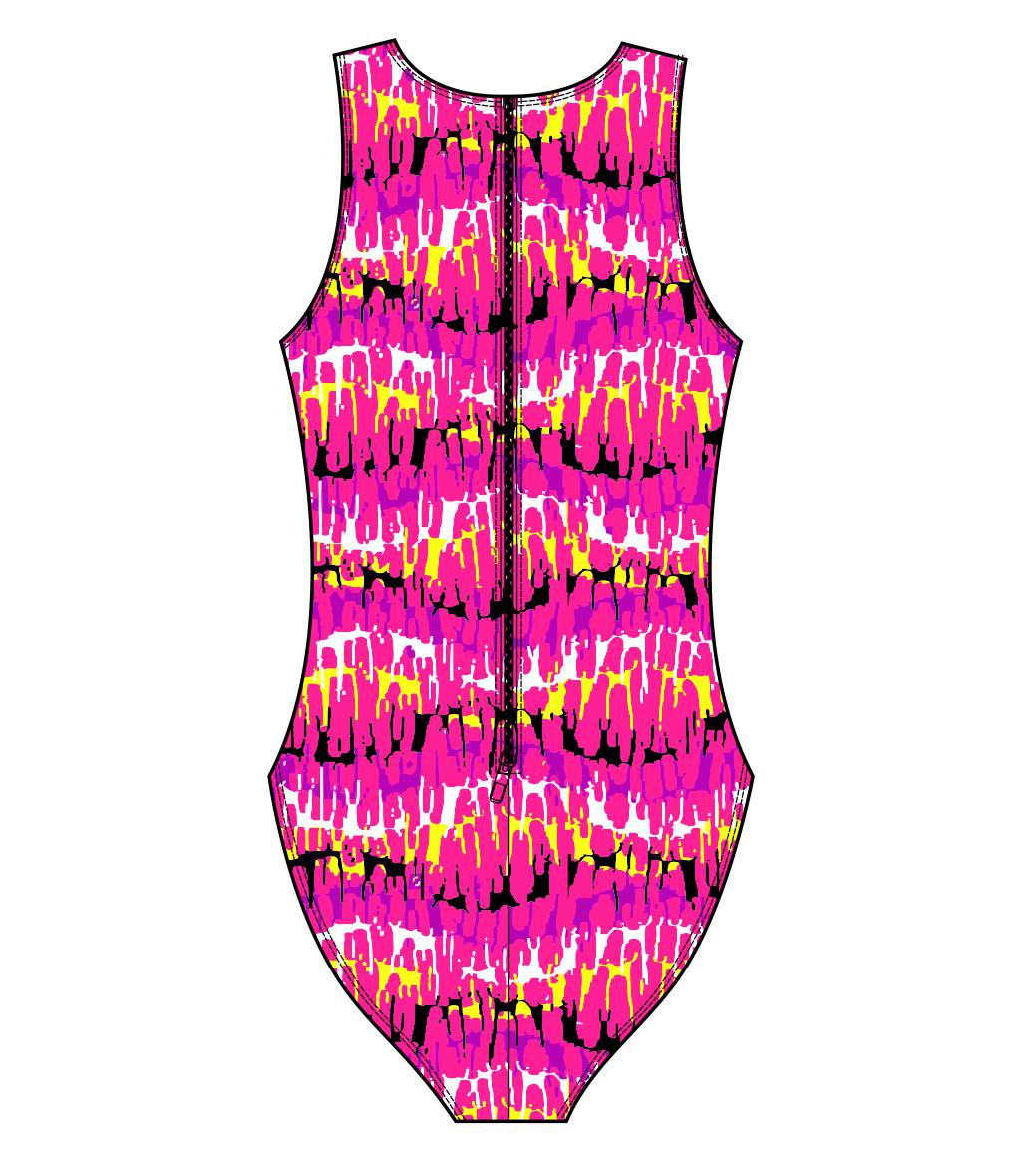 Female polosuit swimsuit, sublimation printed on poly spandex with black nylon knit inner lining.