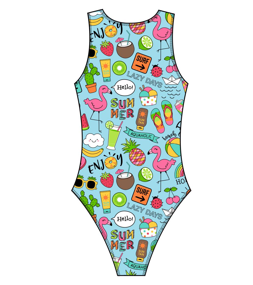 Female polosuit swimsuit, sublimation printed on poly spandex with nylon knit inner lining.