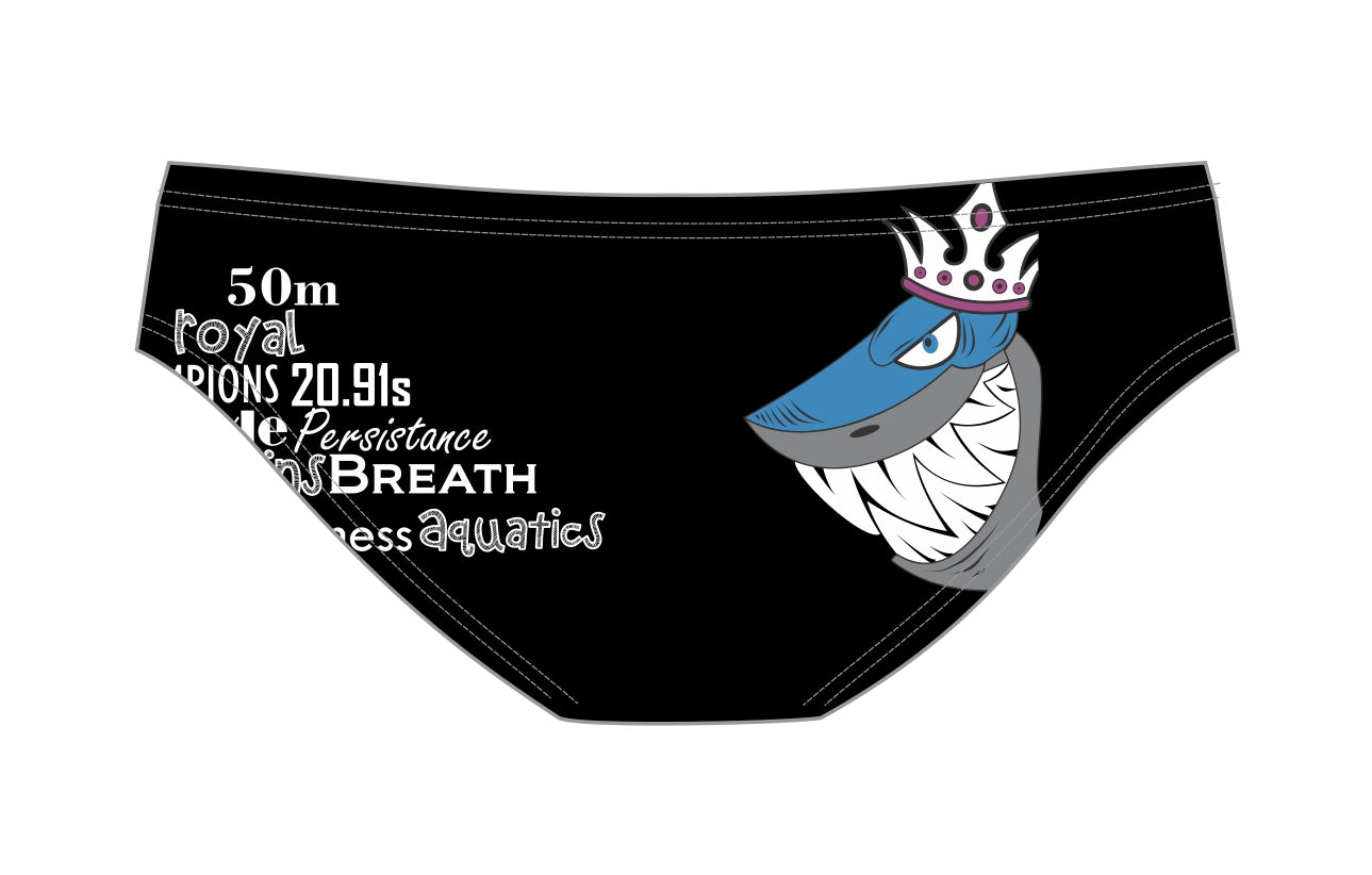 Male swimsuit, sublimation printed on poly spandex with black nylon knit inner lining.