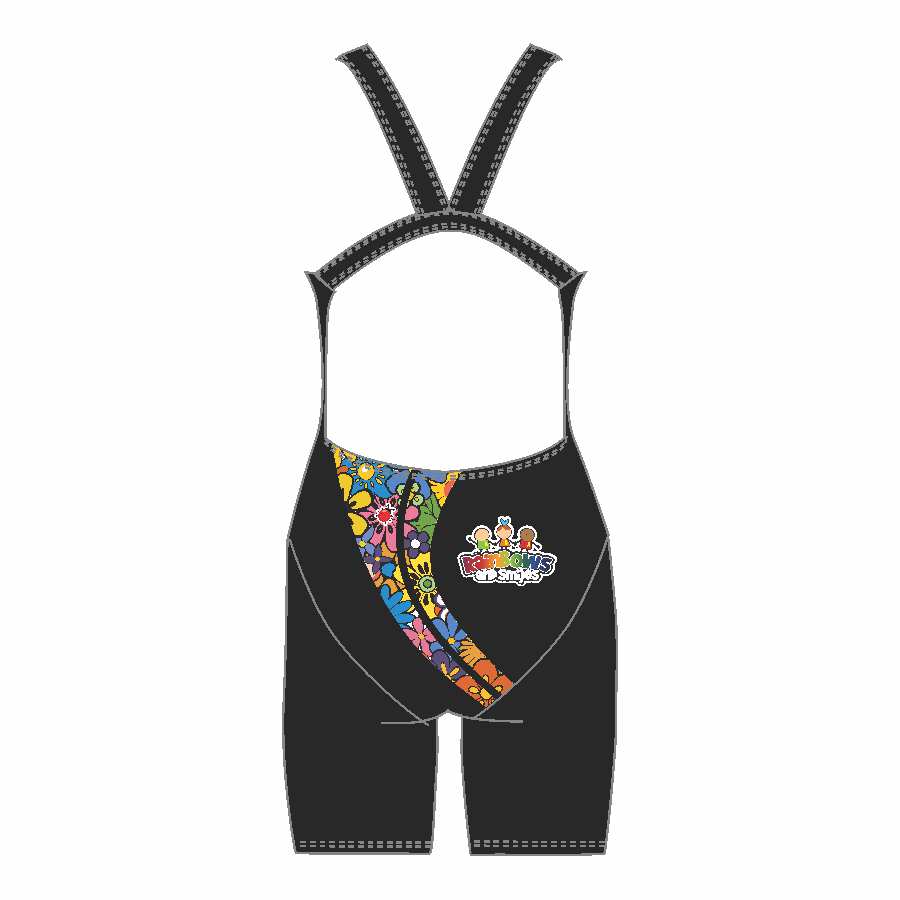 Female kneeskin swimsuit, sublimation printed on poly spandex with black nylon knit inner lining.